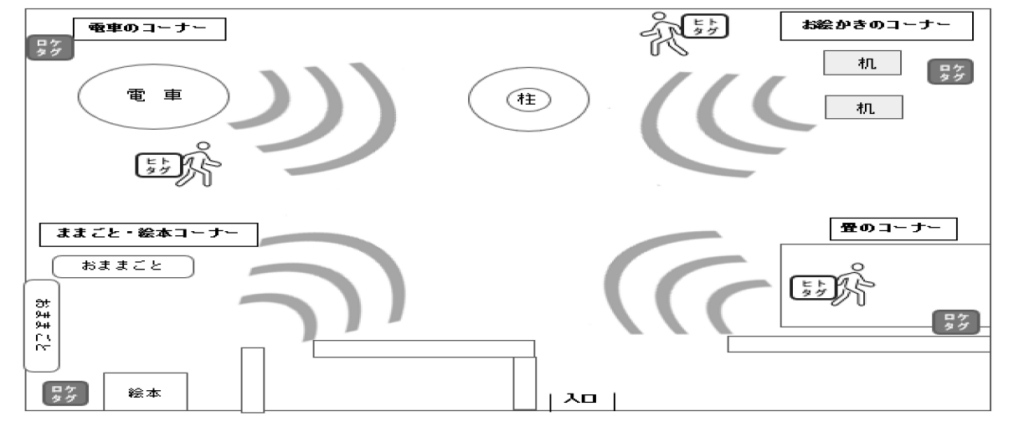 まず活動を行う大学のプレイルームにロケタグを設置しました。そして保育・子育て支援活動に参加する学生にヒトタグを持ってもらい、学生の動きを測定しました。